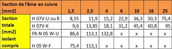 Pour un circuit réalisé avec des câbles H 07V-U, prévus pour l’utilisation domestique, vous aurez :