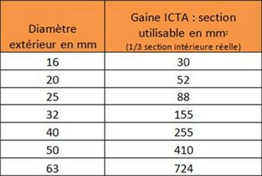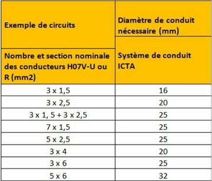Un circuit de 3 fils électriques d’1,5 mm2 pourra passer dans une gaine ICTA de 16 mm.