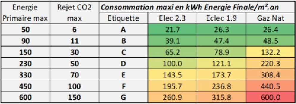 Selon lui, pour une solution électrique, la limite c’est l’énergie primaire de 150 kWhep/m².an. Soit 65.2 kWhef avec le coefficient 2.3 et 78.9 kWhef avec le coefficient de 1.9 et des dépenses qui passent de 13.0 € ou 15.8 €/m².an. Ainsi, en fonction du niveau d’étiquette DPE d’un logement et de l’évolution du Cep de l’énergie électrique (2.3 et 1.9) on peut estimer la consommation maxi d’énergie finale en fonction de l’énergie utilisée avec les limites en énergie primaire ou rejet de CO2.