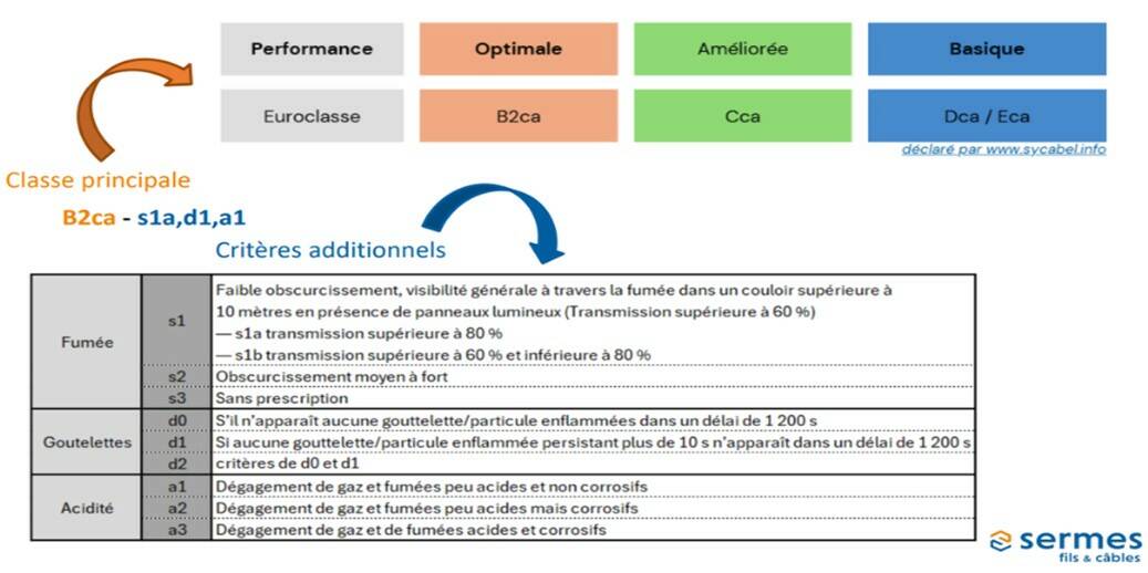 Les euroclasses, permettent aux câbles d’être classés selon leur réaction potentielle à un incendie en cinq catégories : B2ca, Cca, Dca, Eca et Fca. Ces critères sont établis sur la propagation de la flamme et la libération de chaleur. (Voir tableau 1).